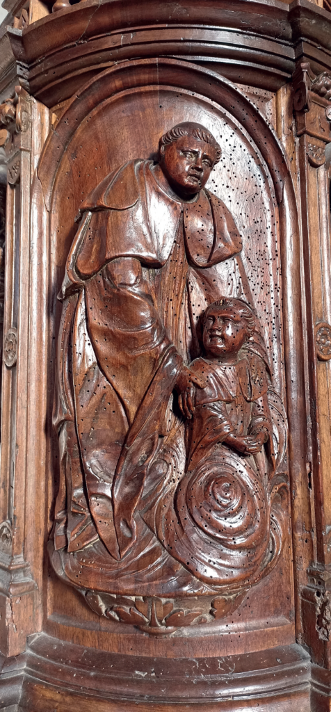 Juste une anecdote : un jour, Benoit envoie le jeune Placide chercher de l’eau dans le lac. Il a soudain la vision de la noyade du garçon. Il envoie Maur lui porter secours. C’est ce que raconte le détail du reliquaire de saint Romain, qui se trouve dans l’église du Thoureil. Le danger est exprimé par un tourbillon d’eau. Le sculpteur représente Maur, jeune adulte, sauvant Placide de la noyade.